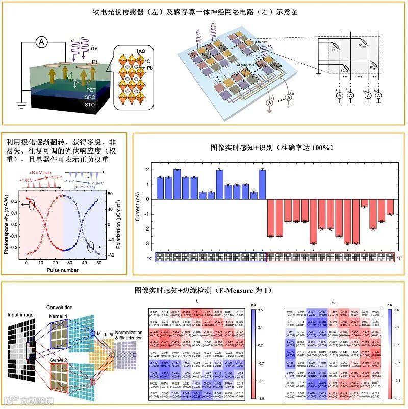 樊贞课题组首先利用铁电Pb(Zr0.2Ti0.8)O3外延薄膜的大极化和受极化调控的光伏效应,构建了高质量铁电光伏传感器,实现了多级、非易失、正负对称可调的光电流。然后将多个铁电光伏传感器组建成为感存算一体的人工神经网络电路,利用光响应度表示权重,证明了原位乘累加运算的可行性,实现了零能耗图像感知与实时处理(含识别、检测等高级处理功能)。