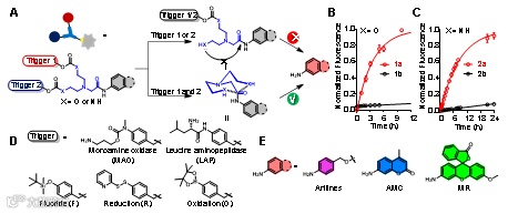 首先,作者成功筛选出Bicine和Dien为骨架的两类分子“与”逻辑门,发生双响应后,其能够发生快速的分子内环化反应,并释放完整的功能分子,释放速率最高可达单响应情况的100倍。同时,作者拓展了该体系的普适性,成功偶联多种触发响应基团和功能分子。随后,作者设计并合成了单胺氧化酶(MAO)和亮氨酸氨基肽酶(LAP)双重响应的“与”门探针,其在细胞成像中比单响应探针具有更低背景信号。进一步地,该探针能够降低血清检测中的假阳性信号,成功应用于不同小鼠模型和肝病患者血清样本的精准鉴别。综上,该工作开发了新型的可控释放策略,有望对疾病的精准诊断和治疗带来关键性突破。