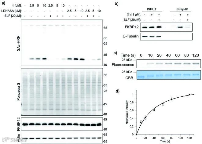 图4. (a) 用1或 LDNASA (2.5-10 µM) 在HeLa 细胞裂解物中标记2 µM的重组FKBP12蛋白的SDS-PAGE 和蛋白质印迹分析。标记时间5分钟。(b) 用1标记HeLa细胞并使用链霉亲和素珠进行免疫沉淀。(c) SDS-PAGE 和凝胶内荧光分析用 10 µM探针2标记 5 µM GRAMD1A (Start domain)。(d) 根据图c数据所拟合的标记反应动力学曲线。