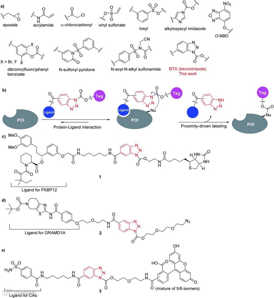 图2. (a) 用于亲和标记的反应基团。(b)BTA化学选择性亲和标记蛋白质的示意图。(c-e)本研究中用于标记 FKBP12(c)、GRAMD1A(d)和carbonic anhydrases(CAs)(e)的化合物。