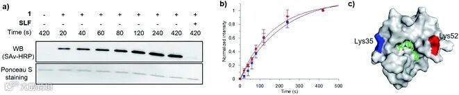 图3. FKBP12 蛋白的体外标记。(a) 5 µM的FKBP12与10 µM 的1 的标记反应的SDS-PAGE和蛋白质印迹分析。(b) 使用 10 µM 探针1(红色)和探针LDNASA(蓝色)与 5 µM FKBP12蛋白的标记反应动力学。实线为单指数方程拟合曲线用于确定 t1/2。(c) FKBP12-SLF复合体的晶体结构(PDB ID:1FKG)。探针1的标记位点标记为红色(Lys52,主要标记位点)和蓝色(Lys35,次要标记位点)。SLF以绿色显示。