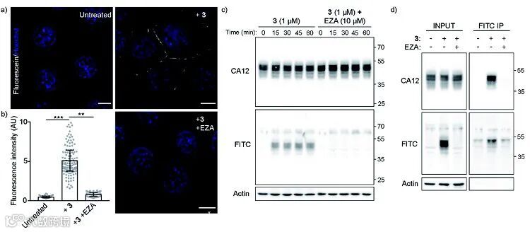 图5. 使用探针3标记内源性CA12蛋白。(a)用探针3标记的MCF7细胞的代表性共聚焦荧光图像。(b)荧光素荧光强度的量化表,数据来源于图5a。(c) 在竞争性抑制剂EZA存在和不存在的情况下用3孵育的MCF7 细胞的蛋白质印迹分析的。(d)用3标记MCF7细胞然后使用抗FITC抗体进行免疫沉淀。CA12 和荧光素标记的蛋白分别使用抗-CA12和抗-FITC的抗体对蛋白质进行可视化。
