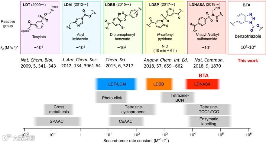 近日,瑞典于默奥大学(Umeå University)的吴耀文教授课题组在Chemical Science杂志上发表论文,他们开发了基于苯并三唑(BTA)的新型亲和标记探针。BTA探针选择性地共价修饰靶标蛋白的配体结合位点附近的赖氨酸残基,半数反应时间(t1/2)最快仅需28秒。反应速率常数可与最快的生物兼容的反应相媲美(图1和2a)。该方法适用于在体外和活细胞中选择性标记细胞质和细胞膜上的蛋白质。BTA化学可广泛用于标记天然/内源性蛋白质、药物靶点鉴定和共价抑制剂的开发。