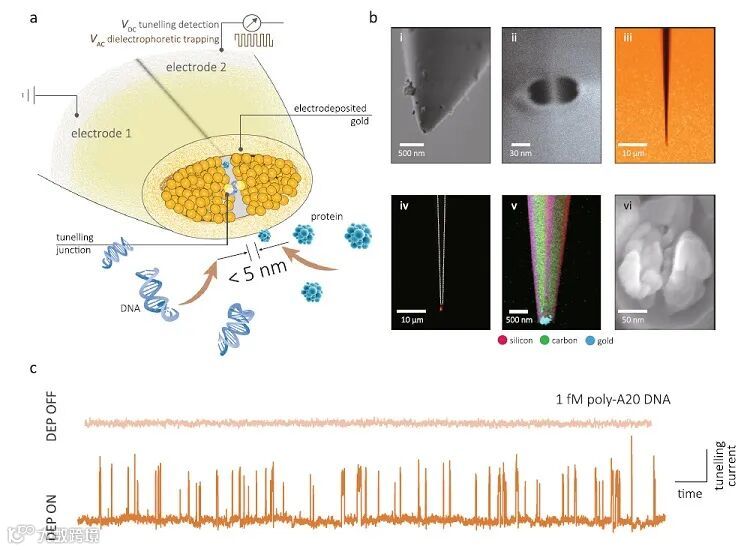 图1. 结合介电泳分子操控的隧穿结器件与单分子超低浓度电学测量。图片来源:Nat. Commun. [4][5]