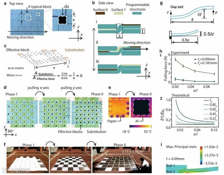 图2. 可切换表面的设计原理。(a) 结构的几何参数和以 x 轴为例的可切换表面设计原理。(b) 拉伸过程中可切换表面的侧视图示意图,实现表面 0 和 1 之间的位置交换。(c) n×n 表面的“有效块”和“替代”说明以及面积比计算方法。(d) 通过拉动 x-(蓝纸)和 y-(绿纸)带来展示完整的 0-1 切换过程的实验样品照片。(e) 红外图像展示了从纸基高 εLWIR 表面到铝基低 εLWIR 表面的完全转变(样品温度~30 ℃)。(f) 米级铝纸样品中表面过渡的演示。(g) 简化梁模型。(h) 不同厚度样品的 s/l 比与拉力的实验 (1) 和理论 (2) 分析。(i) 理论计算的应变分布图。