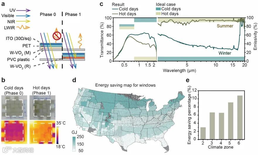 图3. (a) 用于建筑窗户的 ITO/VO2/PVC 样品设计示意图,0和1相分别代表寒冷和炎热的天气。(b) ITO/VO2/PVC 样品在两相上的照片和相应的热图像,有效区域由虚线标记。(c) ITO/VO2/PVC样品的理想情况和实验光谱性能。(d,e) 拟将基于该ITO/VO2/PVC 样品的智能窗户用于美国的 2-6气候区办公建筑,建筑热工计算所得每年估计的HVAC能耗分布图 (d)和节约能源百分比 (e)。