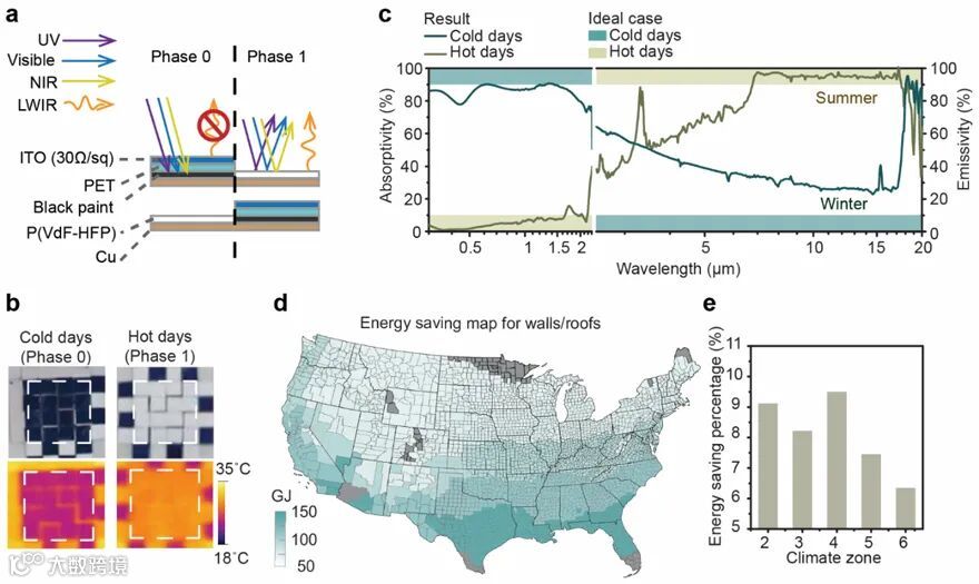 图4. (a) 墙壁/屋顶的 ITO/BP/PVDF-HFP 样品示意图, 0和1相分别代表寒冷和炎热的天气。(b) ITO/BP/PVDF-HFP 样品在两相上的照片和相应的热图像,有效区域由虚线标记。(c) ITO/BP/PVDF-HFP样品的理想情况和实验光谱性能。(d,e) 使用 ITO/BP/PVDF-HFP 墙壁/屋顶样本在美国 2-6 气候区每年估计的 HVAC 节能潜力 (d) 和百分比 (e)。