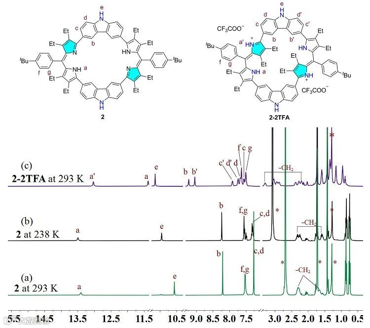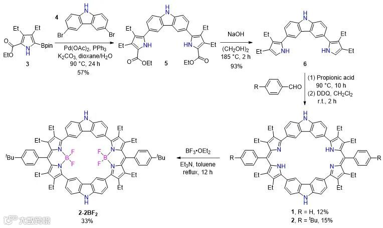 众所周知,咔唑类化合物具有良好的光物理性质,已被广泛用于染料合成。然而,基于咔唑的大环化合物研究却相对较少。为此,研究者首先设计合成了含3,6-咔唑基元的八元扩展卟啉1和2,如图1所示。在上述合成中,吡咯β位的乙基和扩展卟啉中位芳香环上的叔丁基对于改善大环的溶解性至关重要。