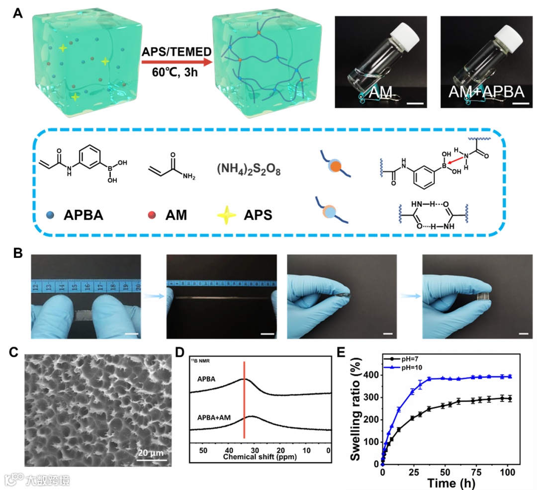 图 1. (A) P(AMx–APBAy) 水凝胶的制备示意图及PAM2和 P(AM2–APBA0.06) 的凝胶化行为。(B) P(AM2–APBA0.06)水凝胶的拉伸压缩照片。(C) P(AM2–APBA0.06)水凝胶的微观形貌。(D)和(E) B-N配位机理验证。
