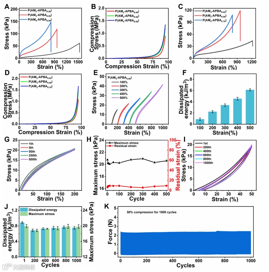 P(AMx–APBAy) 水凝胶具有超弹性,不同应变下的拉伸和松弛轨迹几乎重叠。P(AMx–APBAy) 水凝胶还表现出优异的抗疲劳性能,在200% 的应变下经过500圈循环拉伸后,每一圈应力-应变曲线几乎重合,最大力保持在初始值的95%以上,残余应变保持在10%以内。在50%的压缩应变下经过1000圈循环压缩,每一圈应力-应变曲线同样几乎重合,且最大力与耗散能始终保持稳定。