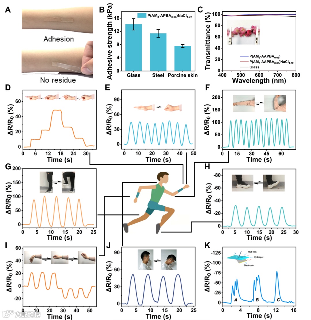 P(AM3–APBA0.06)NaCl1.72水凝胶具有一定的组织粘附性和高透光率,可以稳定监测人体的各项活动,并可作为书写板进行信息传输,在信息加密领域同样表现出潜在的应用价值。
