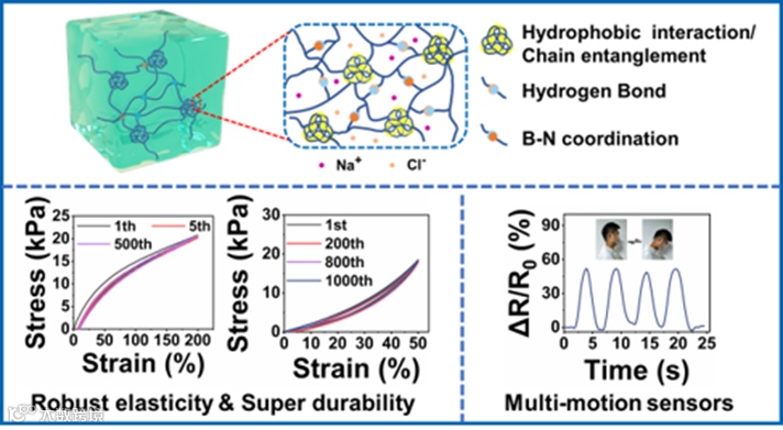 本工作不仅为解决非共价交联水凝胶在多个机械循环过程中出现的明显滞后和力学性能下降的问题提供了新的解决方法,也为柔性电子器件的开发提供了良好的选择。