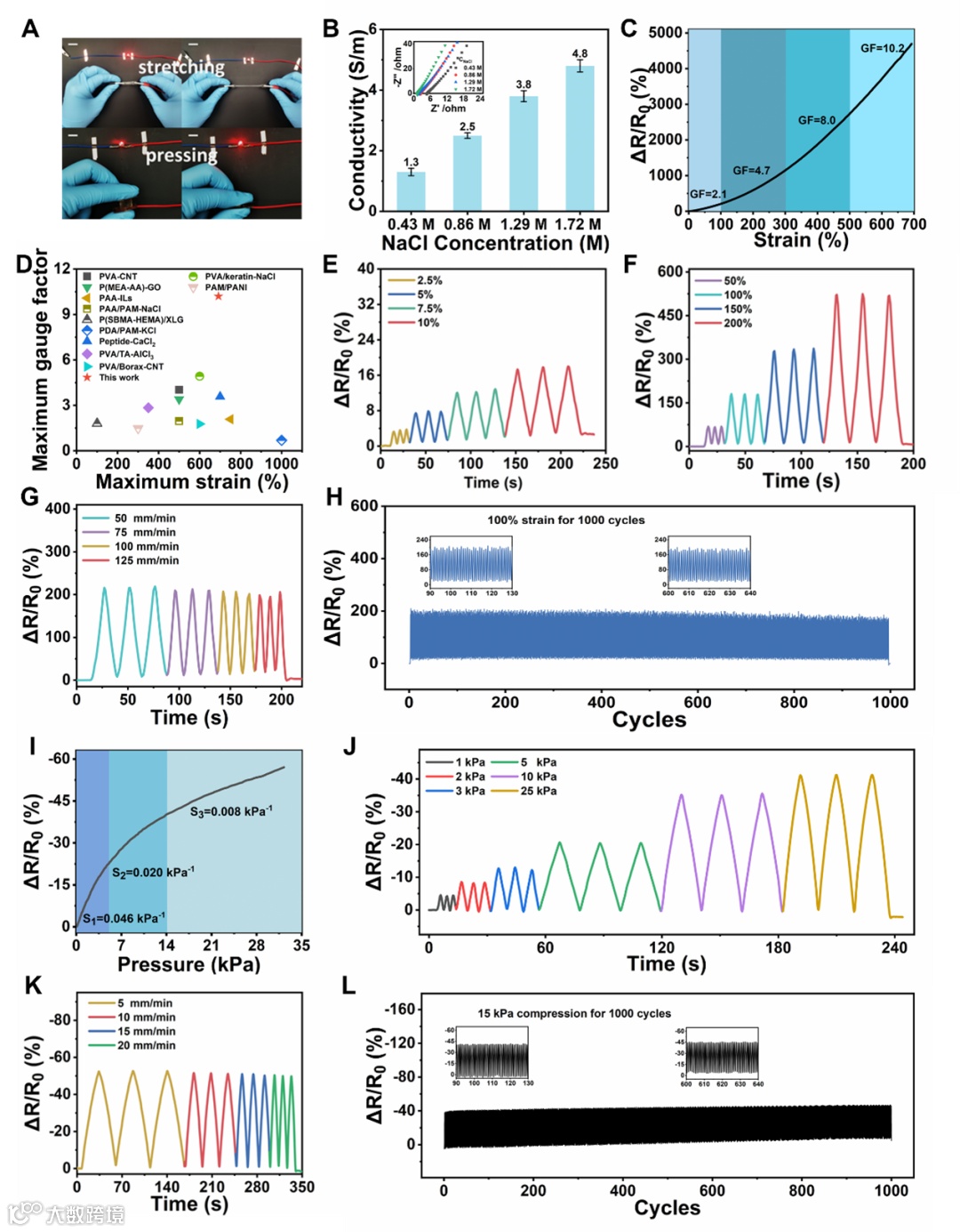 NaCl的引入赋予水凝胶高电导率(4.8 S/m)和优异应变传感系数(GF=10.2)。导电水凝胶可以准确区分各种变形(2.5-200% 的拉伸应变和 1-25 kPa 的压缩应力),并连续输出可靠电信号(100% 应变1000 次循环拉伸和15 kPa应力1000 次循环压缩)。