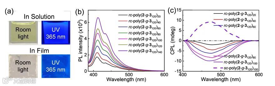 。此外,由于主链的螺旋手性,这些环状聚合物刷还具有圆偏振发光(CPL)性质,主链的螺旋手性控制圆偏振光的偏振方向,聚合物的