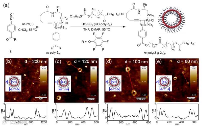 利用这种环状聚合物的合成方法,作者还合成出了侧基含有活性五氟苯酚酯的环状螺旋聚异腈,再通过grafting onto的策略在环状螺旋聚异腈的侧基上接枝聚苯乙烯,成功制备出了环状聚合物刷(图2),通过原子力显微镜作者清楚地观察到环状聚合物刷的形貌。此外,作者还利用了溶液粘度和凝胶色谱等多种手段确证了环状聚合物的结构。