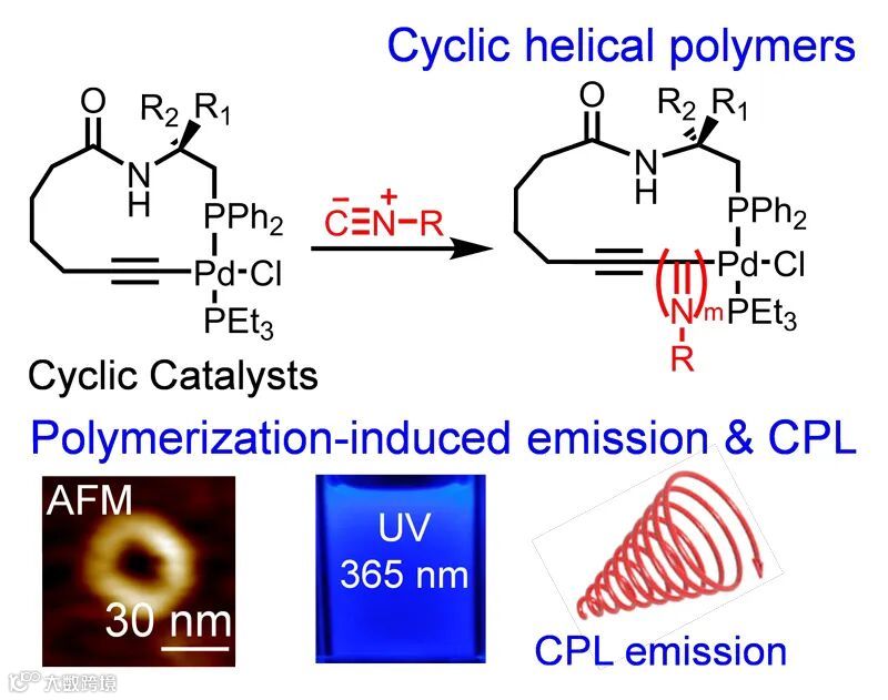 导读:吴宗铨教授团队设计合成了一种手性环状炔钯催化剂,并引发异腈单体的活性可控聚合,制备出了环状的螺旋聚异腈