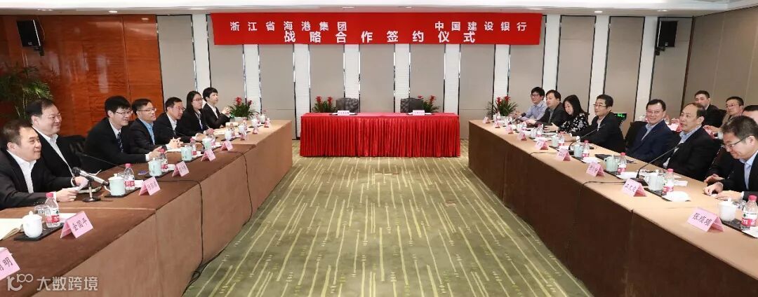 建行总行业务部总经理程远国,浙江省海港集团、宁波舟山港集团总经理、副董事长、党委副书记蔡申康,建行浙江省分行党委书记、行长高强,建行宁波市分行党委书记、行长江文波,建行浙江省分行党委委员、副行长郑浩,建行宁波市分行党委委员、副行长张琐琐等出席并见证了签约仪式。建行总行业务部副总经理张力铮,浙江省海港集团、宁波舟山港集团副总经理、党委委员王峥分别代表双方签署合作协议。