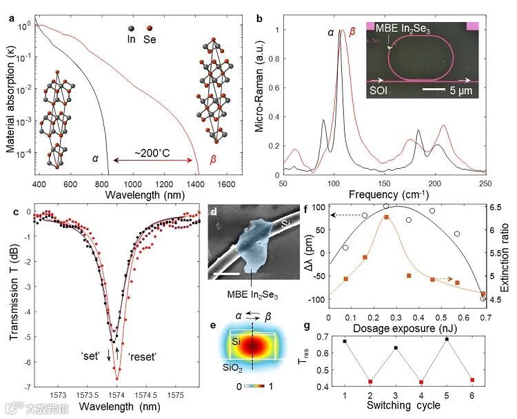 图1. 基于分子外延生长In2Se3硅基微环结构的非易失性全光存储器件。(a)In2Se3两种层状态的吸收系数谱理论值。(b)MBE生长In2Se3薄膜的拉曼光谱。(c)α-, β-In2Se3/硅基微环归一化微环谐振曲线谱。(d)器件扫描电镜图。(e)α-In2Se3与β-In2Se3与波导结构结合的模式分布对比图。(f)激光功率与谐振峰漂移及消光比变化曲线。(g)三次重复实验谐振波长处光传输功率改变情况。图片来源:Adv. Mater.
