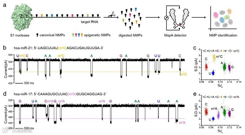 原文(扫描或长按二维码,识别后直达原文页面):Identification of nucleoside monophosphates and their epigenetic modifications using an engineered nanoporeYuqin Wang, Shanyu Zhang, Wendong Jia, Pingping Fan, Liying Wang, Xinyue Li, Jialu Chen, Zhenyuan Cao, Xiaoyu Du, Yao Liu, Kefan Wan, Chengzhen Hu, Jinyue Zhang, Jun Hu, Panke Zhang, Hong-Yuan Chen and Shuo Huang*Nat. Nanotechnol., 2022, DOI: 10.1038/s41565-022-01169-2 参考文献:1. Barbieri, I. & Kouzarides, T. Role of RNA modifications in cancer. Nature Reviews Cancer20, 303-322 (2020).2. Boccaletto, P. et al. MODOMICS: a database of RNA modification pathways. 2017 update. Nucleic Acids Research 46, D303-D307 (2018).3. Shi, J., Zhou, T. & Chen, Q. Exploring the expanding universe of small RNAs. Nature Cell Biology24, 415-423 (2022).4. Smith, A.M., Jain, M., Mulroney, L., Garalde, D.R. & Akeson, M. Reading canonical and modified nucleobases in 16S ribosomal RNA using nanopore native RNA sequencing. PloS one14, e0216709 (2019).5. Begik, O. et al. Quantitative profiling of pseudouridylation dynamics in native RNAs with nanopore sequencing. Nature Biotechnology39, 1278-1291 (2021).6. Ayub, M., Hardwick, S.W., Luisi, B.F. & Bayley, H. Nanopore-based identification of individual nucleotides for direct RNA sequencing. Nano Letters13, 6144-6150 (2013). 导师介绍黄硕https://www.x-mol.com/university/faculty/56491课题组链接http://hysz.nju.edu.cn/bionano
