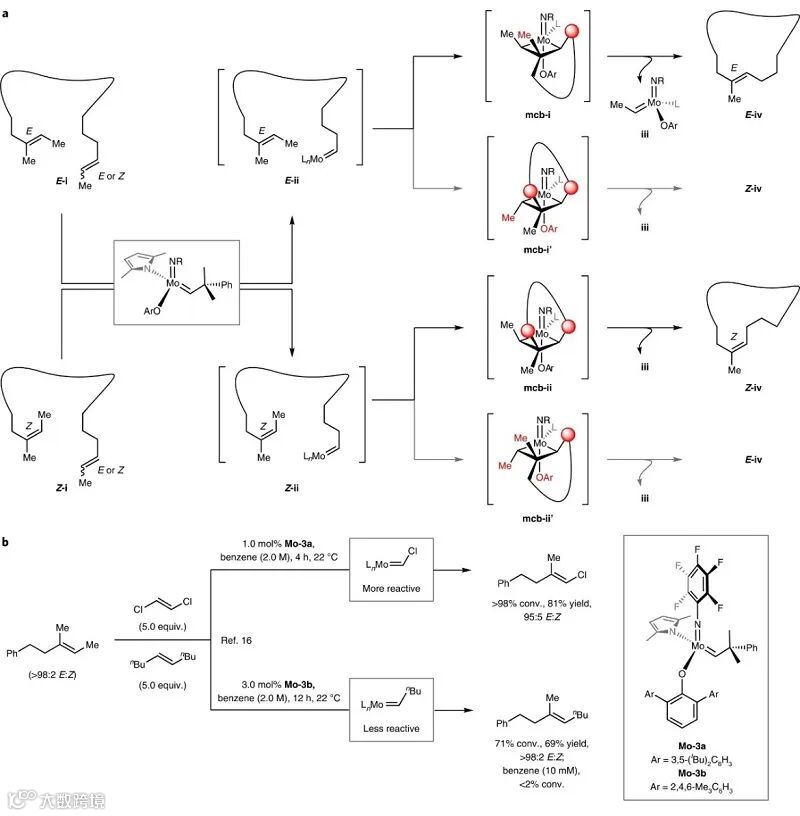 近年来,美国波士顿学院的Amir Hoveyda教授课题组一直从事于立体选择性烯烃复分解催化剂的开发及其应用(Nature, 2016, 531, 459-465, 点击阅读详细;Science, 2016, 352, 569-575, 点击阅读详细;Nature, 2017, 552, 347-354, 点击阅读详细)。在此基础上,作者设想利用立体保留的MRCM策略来构建E-或Z-三取代大环烯烃。具体来说,含有E-三取代烯烃(如E-i)的二烯可与金属钼催化剂反应形成金属环丁烷中间体mcb-i和mcb-i',由于mcb-i空间位阻较小,因此倾向于生成E-iv。同样地,二烯烃Z-i参与的MRCM反应倾向于生成Z-iv(图2a)。近日,他们利用Mo金属催化剂,开发了一种未官能团化三取代烯烃底物发生MRCM反应的通用策略,并成功地构建了一系列E/Z-式大环三取代烯烃,包括大环内酰胺Fluvirucin B1 前体和天然产物Dolabelide C。相关工作发表在Nature Chemistry上,Filippo Romiti教授为共同通讯作者。