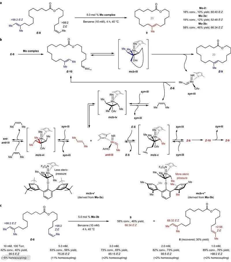首先,作者选择二烯E-8为模板底物,在双芳氧基Mo-2或单芳氧基吡咯(MAP)Mo-3a、Mo-3b的催化下来构建20元大环内酯E-9(图3a),结果显示在10 mM浓度下进行反应时转化率为18-58%,其中Mo-3b催化的分离收率高达46%,但是三种条件下的立体选择性均较差(52:48-66:34 E:Z)。进一步的研究发现MRCM反应可能通过亚烷基-Mo配合物E-10经由mcb-iii分解获得E-9和syn-iii(图3b),其中syn-iii可以与E-8结合再生E-10和Z-丁烯,后者可与syn-iii经由mcb-iv生成E-丁烯和anti-iii,这可能是由于mcb-iv中的Cα甲基与芳氧基配体间的位阻较小所致。值得注意的是,立体选择性降低的主要原因可能是anti-iii反应性较强,后者会快速与E-8反应生成Z-8,进而转化为Z-9和Z-10,同时E-丁烯可与syn-iii反应生成ent-anti-iii。基于此,作者对反应条件进行优化(图3c),发现在温和的真空条件下(100 torr;能够有效去除丁烯)进行反应时,能以高立体选择性(95:5 E:Z)制备E-9,但因E-10与底物E-8的自偶联或副反应导致反应收率较低。此外,随着底物浓度逐渐降低(5.0 nM→1.0 nM),无需真空条件便可将收率从56%增加至76%,并且立体选择性从75:25 E:Z提高至>98:2 E:Z。
