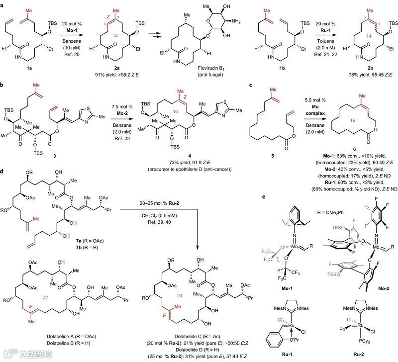 在过去的几十年里,大环闭环复分解反应(MRCM)已成为三取代环烯烃最常用的合成方法之一,并广泛应用于天然产物和药物分子的合成中。例如:1)Mo-1能够有效地催化二烯(1a)的MRCM反应,并以优异的收率(91%)和高立体选择性(>98:2 Z:E)得到Fluvirucin B1的关键中间体2a(图1a),但后续的研究发现该反应存在一定的偶然性,二烯1b参与的反应却只能以55:45的Z:E比得到2b;2)Mo-2催化三烯(3)的复分解反应并以73%的收率和91:9的Z:E比获得epothilone D的前体4(图1b)。与Mo-1相比,Mo-2有所改善但底物适用性较差,比如较少官能团化二烯5的MRCM反应效果不佳(图1c);3)利用Ru-2催化烯烃的MRCM反应来构建24元不饱和大环内酯(即具有抗癌作用的天然产物Dolabelide C和Dolabelide D),但其收率较低并且立体选择性较差(图1d)。此外,这些反应通常需要高催化剂负载量、高温以及较长的反应时间才能获得单一的烯烃异构体。另一方面,经炔烃复分解及其立体选择性转化也能构建三取代烯烃衍生物,但因导向基团、大环炔烃的张力以及选择性问题等严重阻碍了该方法的应用。