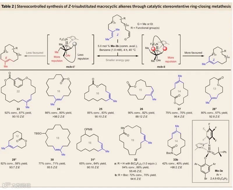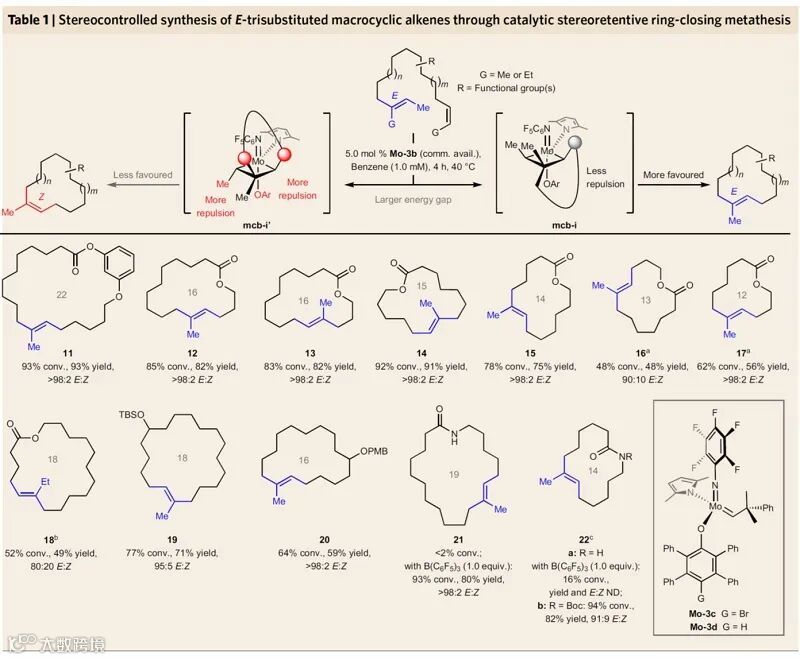 图4. 立体选择性保持的闭环复分解反应合成E-三取代大环烯烃。图片来源:Nat. Chem.