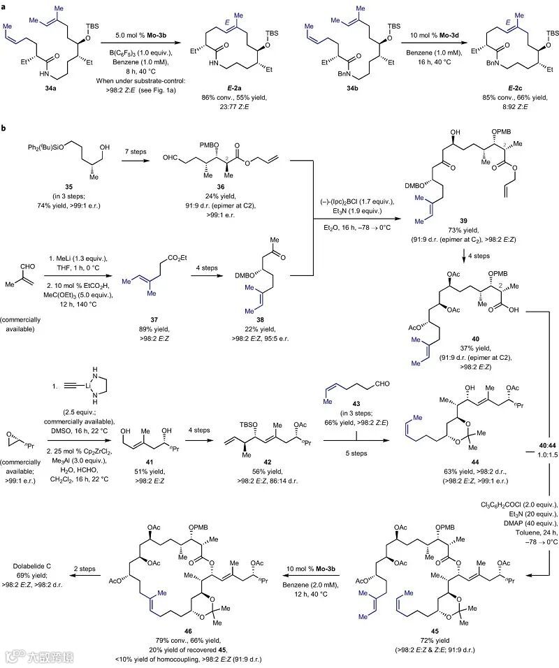如上所述,立体保留策略具有一定的可行性,但是关键的问题在于立体保留MRCM反应与底物控制的选择性之间的抗衡关系。为此,作者选择14元大环内酰胺fluvirucin B1前体Z-三取代烯烃(2a)进行了立体选择性反转的探索。如图6a所示,向二烯底物(34a)中添加B(C6F5)3后能以低立体选择性(23:77 Z:E)获得E-2a。进一步的研究表明更灵活的叔酰胺部分会形成更多可用的构象,并且其中一些易进行RCM反应以提供所需的E-异构体,例如:苄基酰胺(34b)能以66%的收率和8:92 Z:E选择性生成E-2c。随后,作者以完全立体选择性的Dolabelide C的全合成证明了该方法的可靠性(图6b)。事实上,Dolabelide C全合成的关键前体是E-大环三取代内酯(46),后者可由45经大环闭环烯烃复分解反应制备而成。其中关键砌块(45)的构建主要分为以下三条路线:1)以醇(35)为原料经过七步转化得到醛化合物(36);2)以三取代烯烃(37)为原料经四步转化获得酮化合物(38);3)以三取代烯烃(41)为原料经9步转化构建主要的中间体(44)。上述醛(36)和酮(38)的羟醛缩合反应能以73%的收率和91:9 d.r.值获得β-羟基酮(39),后者经4步转化获得中间体(40),接着(40)与(44)进行反应便可得到关键砌块(45),随后在Mo-3b的催化下进行大环闭环烯烃复分解反应,以66%的收率和>98:2 E:Z比获得关键的中间体E-大环三取代内酯(46),最后经两步处理便可以高非对映选择性获得Dolabelide C。总之,作者以39步总路线、19步最长线性步骤(LLS)以及2.0%的总收率实现了Dolabelide C的全合成,而先前的方法则需要50步总路线、27步最长线性步骤(LLS)并且总收率仅为0.3%。