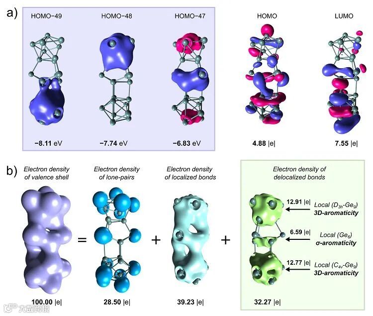 图2. (a) 团簇Ge244−的部分分子轨道;(b) Ge244−的价电子密度的化学成分与EDDB方法得出的相应电子布居对比。等值面的值被设定为±0.015|e|。