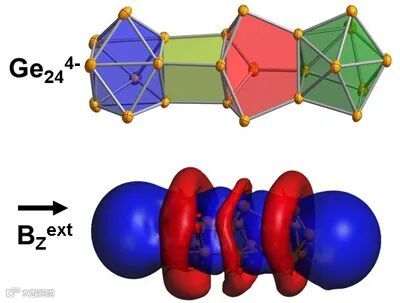 图1. 团簇Ge244−的扁长型结构特征和磁响应分析