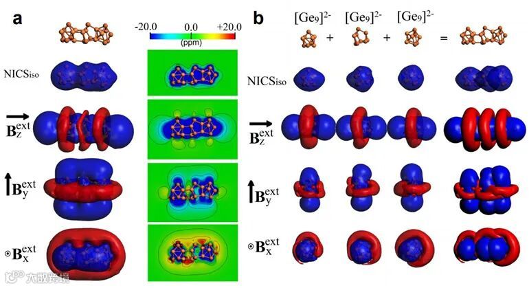 图3. (a) 团簇Ge244−的NICSiso和特定方向外部磁场的等值面和等高线图。等值面的值被设定为±3.0 ppm。(b) 团簇Ge244−中三个独立的Ge94−单元的NICSiso和特定方向外部磁场的等值面和等高线图。等值面的值被设定为±3.0 ppm。