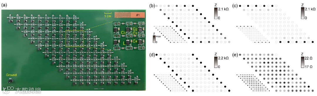 图2: (a) 实验所用印制电路板。(b)-(e) 不同“晶格”形变下的阻抗测量结果。