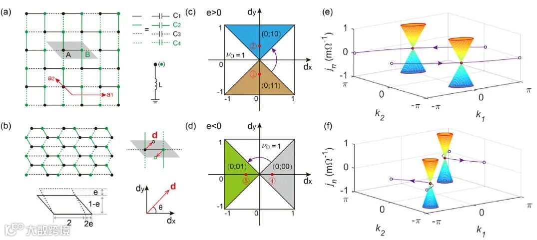 图1:(a) 二维SSH电路“晶格”模型。(b) 引入中心对称形变后的SSH“晶格”。(c)(d) 不同形变参数下的相图,其中彩色区域表示有带隙“弱”拓扑绝缘体相,白色区域对应于无带隙的狄拉克半金属相。(e)(f) 狄拉克锥在布里渊区中移动。