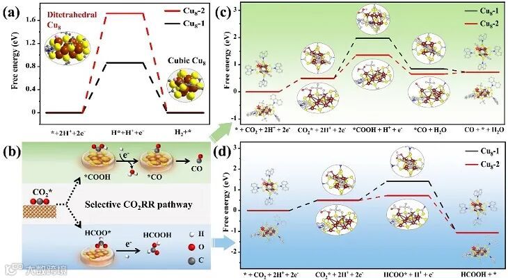 DFT计算表明,不同内核Cu8簇上CO2还原反应与析氢反应具有不同的竞争能力,在双四面体Cu8簇上的析氢过程比立方体Cu8簇上的更受抑制,而且形成HCOO*中间体所需的自由能变化更低,这共同主导了双四面体Cu8簇的高反应活性和催化CO2还原的选择性。该研究通过在原子级水平定制内核构型和表面形态来制备铜纳米簇,以实现高效和高选择性的CO2RR。为铜基纳米材料催化CO2还原提供了更深层次的见解,也为设计定制铜基CO2RR催化剂提供了更多的参考和借鉴。