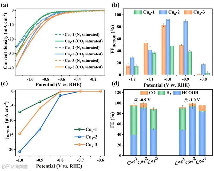 电催化实验结果表明,不同的铜簇内核结构赋予这些Cu8簇不同的CO2RR催化活性和选择性。在较宽的电位范围内,双四面体构型的Cu8簇相比于立方体构型的Cu8簇显示出更高的选择性和法拉第效率。在-1.0 V时,双四面体构型Cu8-2簇催化CO2转化为HCOOH的法拉第效率高达92%,远高于立方体构型的Cu8-1簇。结构分析显示两种不同构型Cu8簇呈现出不同的边角活性位点结构。在立方体构型的Cu8簇中,双齿配体与Cu配位时形成了近似相等的S–Cu–S键角(~118°),而在双四面体构型的Cu8簇中,由于一个双齿配体被一个tBuS-配体取代,从而使其配位模式发了扭曲,形成的键角和键长均发生了明显变化。