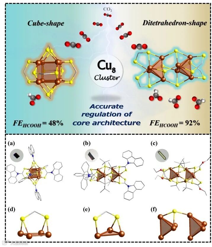 近日,郑州大学臧双全教授团队采用配体调控策略合成了由两种构型的金属内核组成的三种新型异构Cu8簇(Cu8-1, Cu8-2, Cu8-3),并在原子水平上研究了不同内核构型对Cu8簇电催化CO2RR的影响。单晶结构分析表明,Cu8-1由单一双齿配体保护,具有立方体内核结构。当双齿配体被tBuS-部分取代时,可以得到具有双四面体内核结构的Cu8-2和Cu8-3团簇。