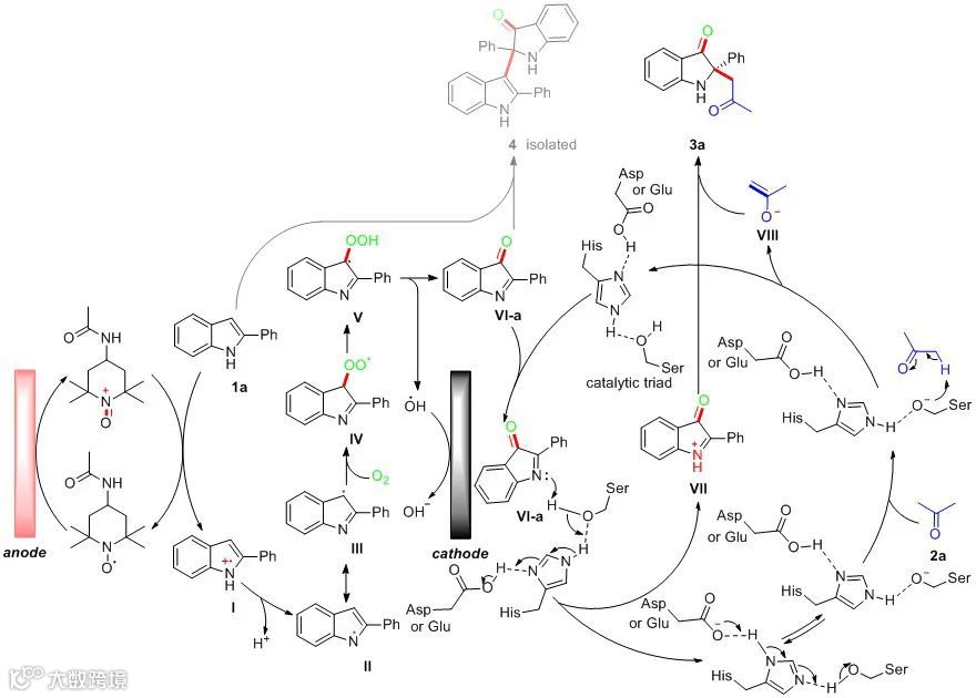 结合脂肪酶的非天然催化活性和有机电合成的不对称催化反应,实现了2-取代吲哚化合物与简单脂肪酮的不对称氧化交叉偶联反应