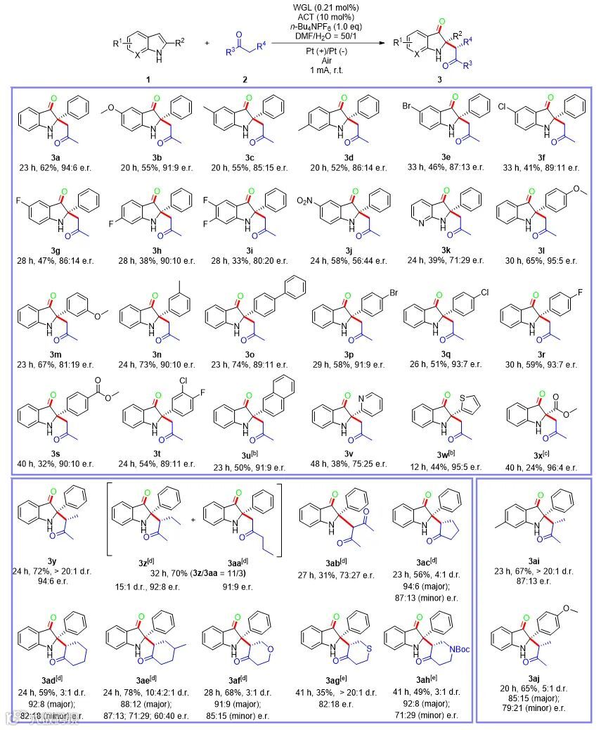 , 收率31–78%,e.r. 60:40–94:6,d.r. 2:1–20:1)。取代基改变的吲哚底物与丁酮反应,也能获得不错的收率和立体选择性(