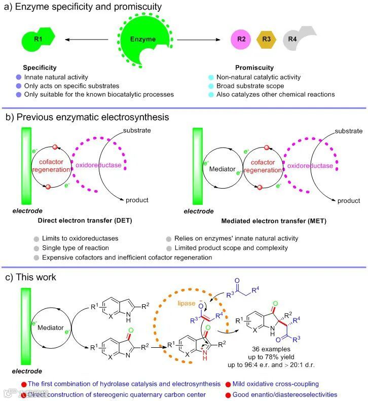 酶促电合成 (Enzymatic electrosynthesis) 结合了酶催化和电化学技术,通过酶和电极之间直接或间接的电子转移过程催化氧化还原反应,从而获得所需产物。由于酶的高特异性,酶促电合成通常具有较高的选择性和产率,是一种高效、绿色和清洁的新型合成技术。然而,这种策略很大程度上局限于氧化还原酶的使用,并且主要依赖酶固有的天然活性,使反应类型、底物范围和产物的复杂性比较局限。此外,这种方法通常需要昂贵的辅助因子,而很多情况下辅助因子的再生效率并不高。