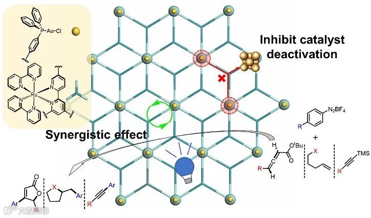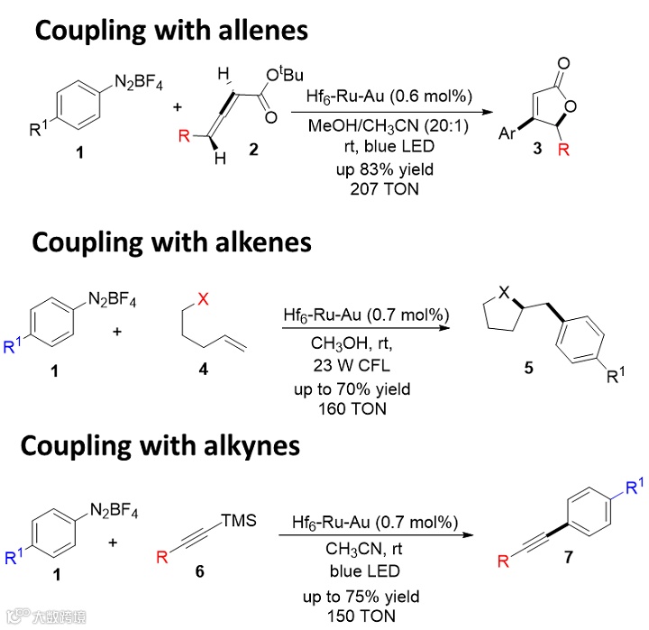 图3. 双功能金属有机单层材料Hf-Ru-Au催化的三类偶联反应