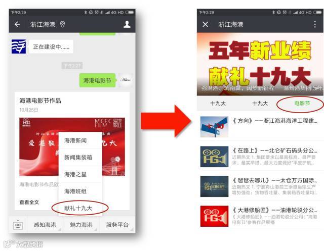 PS大家如果想观看之前的微电影,只需发送关键词“海港电影节”点击链接或点击子菜单“魅力海港”——献礼十九大——电影节便可收看。