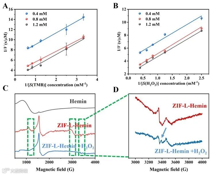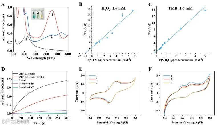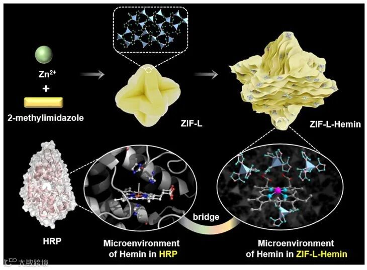 当血红素嵌入ZIF-L层间后,ZIF-L内部悬挂的咪唑基团将替代天然酶分子中的组氨酸与血红素分子配位,并在催化过程中起到稳定反应中间体和促进H2O2分解的作用。实验证明所构筑的ZIF-L-Hemin与天然酶中血红素的配位状态(图3)和催化机理(图4)等方面非常相似,极大地促进了血红素分子的催化活性(图5)。