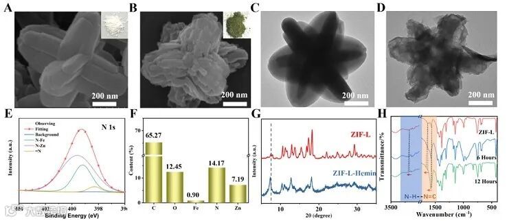 ZIF-L是一种由Zn2+与2-甲基咪唑组成的二维网络通过氢键作用力堆叠而成的三维MOF结构,其内部含有大量未配位完全的2-甲基咪唑。文中通过与ZIF-L具有相似结构的ZIF-8作为对比,结合多种表征技术证明了血红素嵌入在ZIF-L的二维单元之间(图2)。