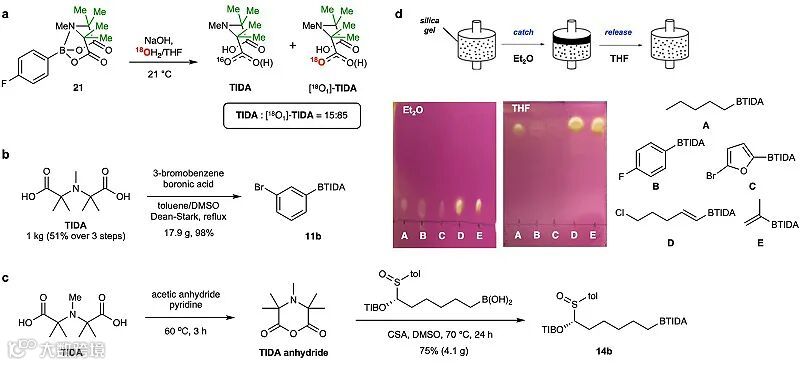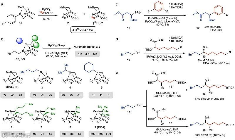 首先,作者使用18O-H2O来探究MIDA硼酸酯1a的水解,并研究了N-B键作为碱性水溶液Csp3-Csp2 Suzuki-Miyaura偶联条件(THF/H2O,K2CO3,60 °C)下的主要水解机制(图3a),结果意味着需要开发一种MIDA衍生物来抑制N-B键的受阻Lewis酸碱对(frustrated Lewis pair, FLP)活性。如图3b所示,作者使用1H NMR研究了一系列MIDA衍生物(1b,3-9)在氘代溶剂(THF-d8/D2O,K2CO3,60 °C)中的稳定性,结果显示氮上带有大位阻基团的MIDA衍生物(3-5)显著增加了水解速率,而在亚氨基二乙酸主链上带有两个正丁基的衍生物(6)则几乎没变化,若将这些取代基替换成乙基(7)和甲基(8)则增加了稳定性。最后,作者制备了一种衍生自MIDA的四甲基化的大位阻硼酸酯9(TIDA),后者在碱性水溶液Csp3-Csp2交叉偶联条件下高度稳定,反应6 h后仍剩余超过99%。当Csp3-硼酸酯10和TIDA硼酸酯11b在Csp3-Csp2 Suzuki-Miyaura条件下进行反应时,能以较好的收率得到目标产物12并且TIDA硼酸酯得以保留,而MIDA硼酸酯11a却没有产生所需产物(图3c)。随后,作者测试了TIDA硼酸酯对iPrMgCl.LiCl的稳定性,该条件可促进 Csp3-Csp3键形成(图3d)。结果显示TIDA硼酸酯14b可耐受iPrMgCl.LiCl,以高产率和高立体选择性形成目标产物15,而MIDA硼酸酯14a在这些条件下却被裂解。需要指出的是,TIDA硼酸酯甚至还能耐受高反应性的tBuLi,从而以优异的非对映选择性形成产物18和19(图3e)。
