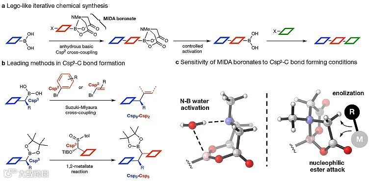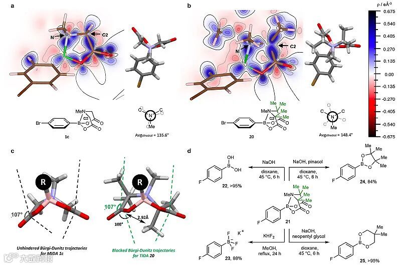 近日,UIUC的Martin D. Burke教授与Daniel J. Blair博士等人终于完成了这种技术升级。他们通过超共轭和空间位阻调节,开发了一种新型的四甲基N-甲基亚氨基二乙酸(TIDA)硼酸酯,高效地实现了Csp3-C键的自动化迭代构建。TIDA硼酸酯的稳定性有了明显改善,电荷密度分析显示电子密度的重新分布增强了N-B键的共价性,从而缓解了TIDA硼酸酯的水解问题;而羰基π-面的互补空间屏蔽则降低了TIDA硼酸酯与亲核试剂的反应性。此外,TIDA硼酸酯还保留了亚氨基二乙酸笼的独特特征,这对于通用自动化合成来说是必需的。相关成果发表在Nature 上。