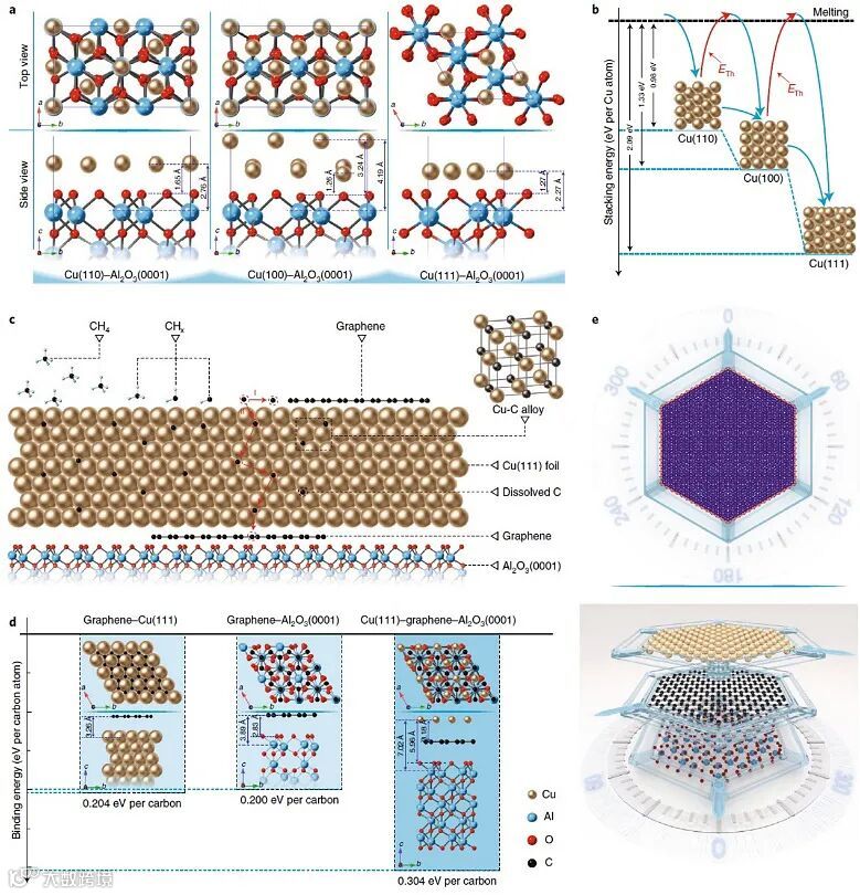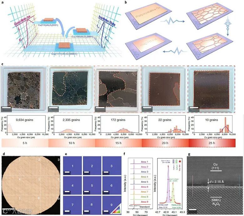 的延长,Cu晶粒尺寸逐渐增大、晶界减少,最终得到了直径2英寸的单晶铜(Cu(111))薄膜。经过长期退火后(>25小时),铜箔逐渐紧密地贴附在蓝宝石表面,没有任何间隙,界面处出现~2.15 Å厚的原子突变,诱导了均匀的超晶格势,有助于石墨烯形成保持相同取向。有趣的是,这种多晶铜至单晶Cu(111)薄膜的完全转变在其他衬底上都没有观察到,比如石英、