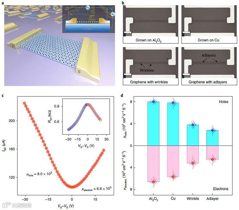 为了证明这种方法的应用价值,研究者基于所得晶圆尺寸石墨烯制备了场效应晶体管(FET)。100个晶体管的平均电子流子迁移率为6.6 ×