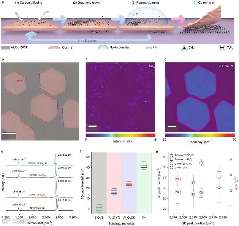 (0001)异质结构中。扩散的碳原子开始成核,并在界面处形成晶体取向相同的石墨烯岛。然而,生长在铜膜表面的石墨烯会阻止碳源向界面扩散,降低生长效率。因此,生长一段时间后,需要将系统迅速冷却,并利用氢-氩等离子体去除铜膜上表面的石墨烯。而铜膜对等离子体具有屏蔽作用,可有效保护下面的石墨烯不受破坏。上述过程经过多次循环后(10个周期),界面处制备出单晶石墨烯。