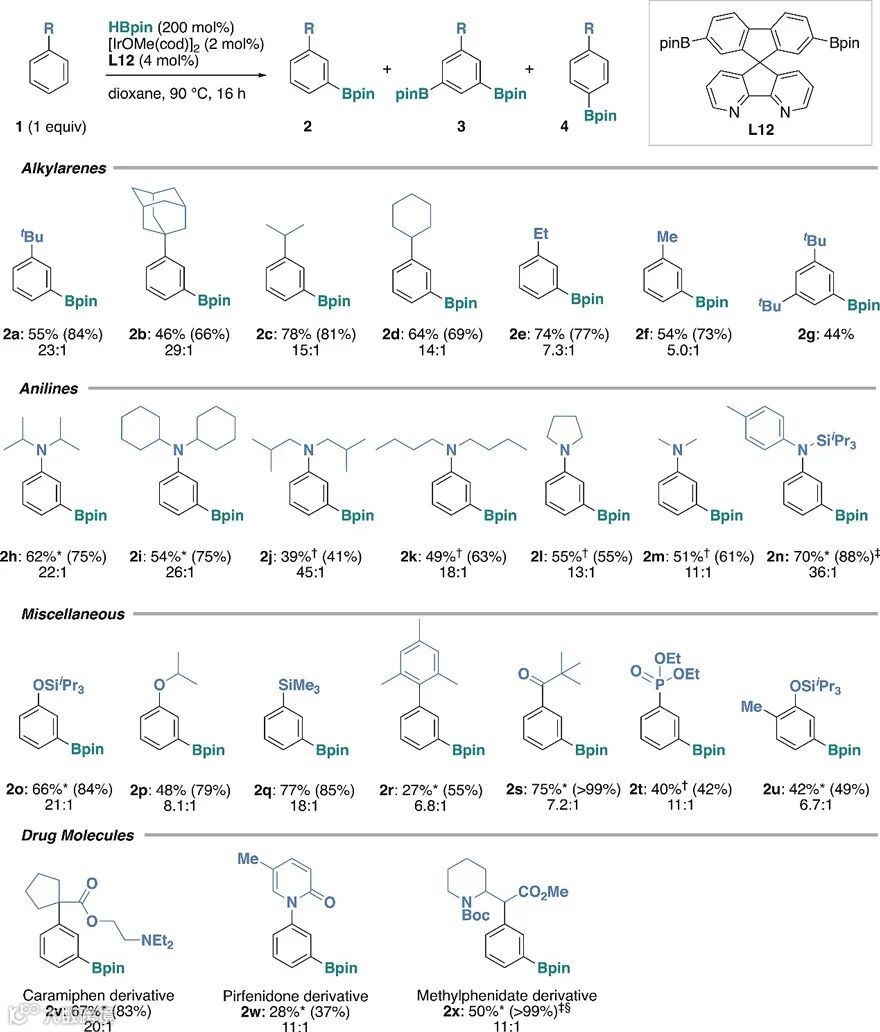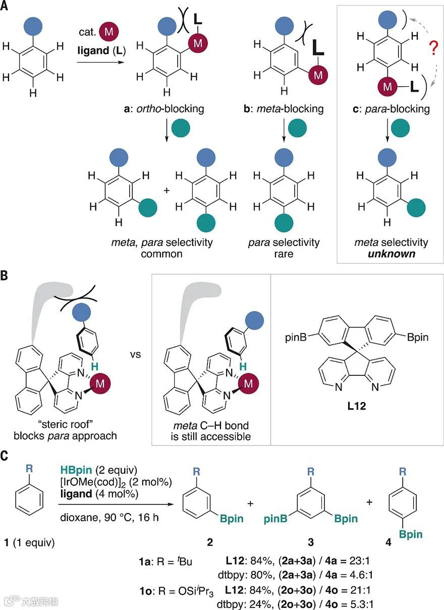)螺联吡啶配体(L12),后者有效地阻断了对位选择性,从而在铱催化下实现了单取代芳烃的间位选择性C-H键硼化反应