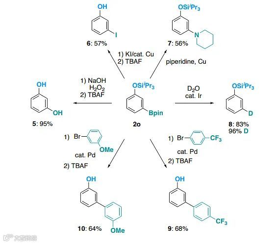 )可以50%的分离收率和11:1的间位选择性获得硼化产物。最后,作者以三异丙基硅基苯基醚(